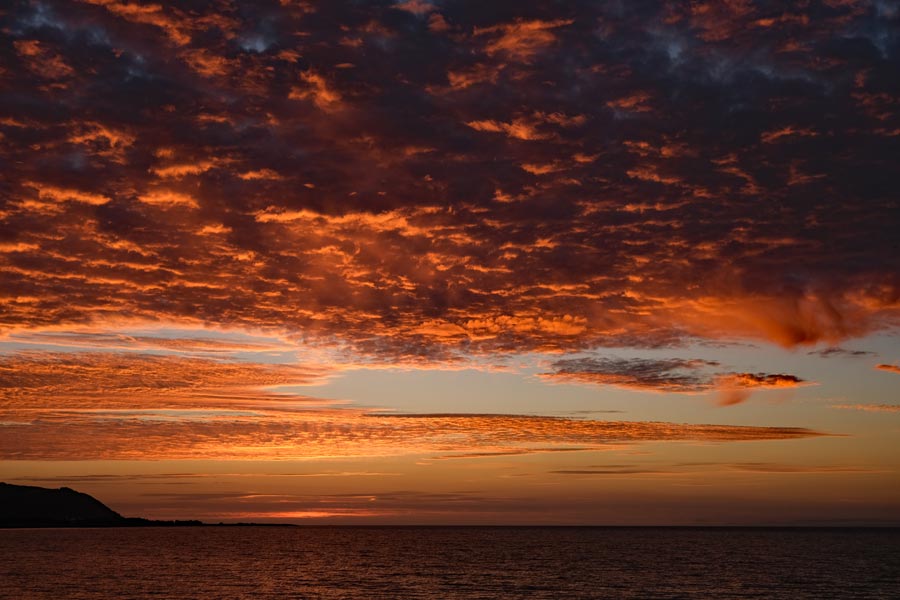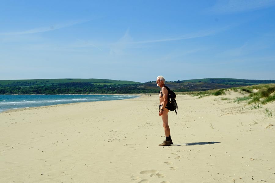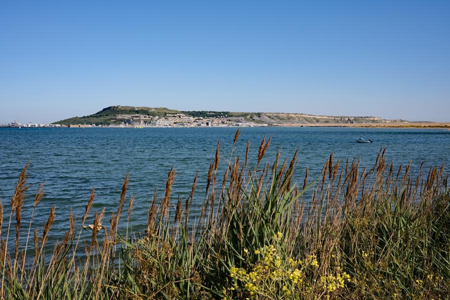 Walking the SWCP in the reverse direction June 2022. View from across the Fleet lagoon with the back of Chesil Beach on the right.