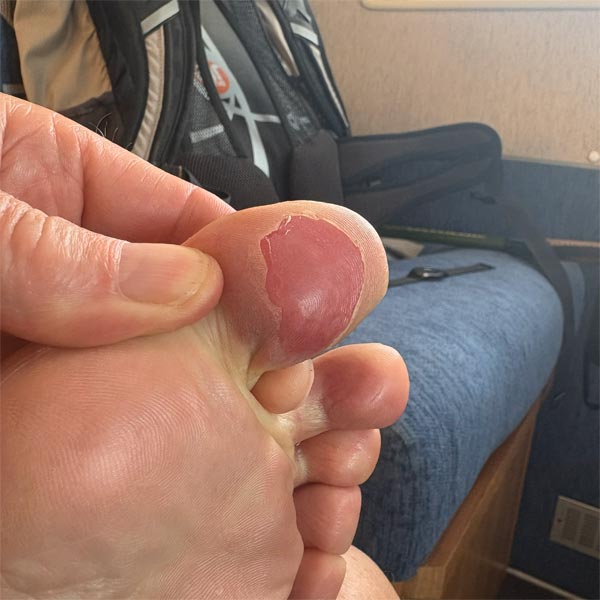 Before I drove home I decided to check on my blister as it had recently started to hurt again. When removing my sock, the Compeed plaster on my toe came with it and with it a lot of soft, loose skin. The result was a very large sore area. I found that the universal insoles, marked with trimming lines and for use up to size 12, that I had bought at Mountain Warehouse in Lymington on the first day of my walk were 10mm too short for my size 11 boots (even though I had not trimmed them) and so both of my big toes had been rubbing on the front edge of the insoles. This edge had caused the Compeed plaster on my left toe to be peeled away from the blister bit by bit as I walked, causing the sticky side to fold over and glue itself firmly to my thick walking sock.