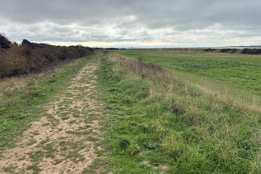 The path remained along the top of the sea defences bank. Inland there was a ditch and a fence and beyond that there were fields with cows grazing. After just over a mile the path arrived at Walker Point. Less than a mile further on the bank became impassible due to dense bushes and the path was sign-posted slightly inland. I came to a path with high hedges on both sides where there were two soldiers and an impressive military vehicle parked touching both hedges. I thought that I had taken a wrong turn. When I enquired, I told that I was on course and to just squeeze past the monster. After a while the track became an open pathway again. At Pilsey Sand there was a white sandy beach which I started to walk on but a sign warned that the beach was restricted for bird protection purposes. I took the path that turned away from the beach and arrived at Longmere Point where, shortly afterwards, the path turned northwards along the Thorney channel.