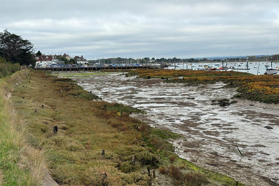 I returned by bus to the point on the A259 that I had reached the day before and walked the short distance to the start of the footpath to Bosham. Once again the morning was bright but cloudy and the tide was out. Along the banks of the Bosham channel there were several interesting and abandoned quays and slipways. At the centre of Bosham, the houses along the waterfront were on a raised bank above the road which had a warning notice about the road becoming submerged during some high tides. Here I stopped at the Shoreside Cafe for a coffee and to check my onward route.