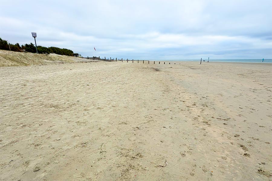 I parked my campervan in Hythe as this was where I thought that I might be spending my first night. I took an early morning bus back to Lydd-on-Sea and started walking east. Another fine week had been forecasted and it was already getting warm. There was little wind. I walked on the firm sand near the water's edge rather than the pavement alongside of the road. After a few miles there was a slipway and from then on there was suitable walking on grass, rough track and finally a proper walkway.