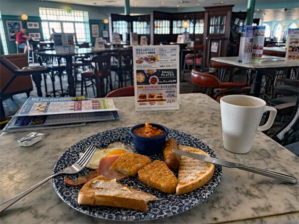 You may have noticed that I nipped into the odd Wetherspoon establishment on some of my south east coast walks. This was because I realised that I was able to get a breakfast there as early as 8am. I liked having breakfast in a 'Spoons' because I knew exactly what I was going to get, the service was good and so were the prices. I also liked to see the interesting buildings, outside and inside, that are now a Wetherspoon. So if there was one nearby and it was breakfast time I would pop in for one, or if it was after mid day, I often popped in for a pint.